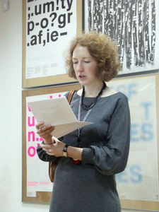 | Открывала выставку вместо заболевшего М. Жукова – Члена Совета директоров TDC – В. Евстафьева – шрифтовой дизайнер и каллиграф |