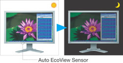 Сенсор Auto EcoView на передней панели монитора (улучшенная версия опции BrightRegulator) фиксирует уровень освещённости, регулируя яркость экрана. Его задача — обеспечить условия просмотра, эквивалентные чтению с бумажного листа в стандартных офисных условиях. По информации разработчиков, экономия составляет до 39% по сравнению с установками по умолчанию.