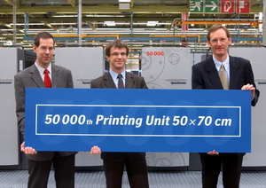| Слева направо: менеджер по сборке машин форматов 35х50 и 50х70 Иоахим Денкер, ответственный за технологию и производство член правления Heidelberg Штефан Пленц, руководитель направления форматов 35х50 и 50х70 Бернд Блюмберг на фоне Speedmaster SM 74 с 50 000-ой печатной секцией второго формата |
