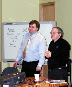 Ден Гелберт (справа) объясняет отечественным полиграфистам основы CTP-технологий, 2004 г.