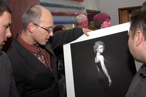 Менеджер HP по развитию категории широкоформатных принтеров Денис Лобзов демонстрирует качество печати: чёрное платье на чёрном фоне отлично проработано