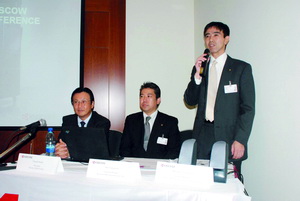 | Речь для прессы глава представительства М. Учикура произнёс по-русски. Слева — Т. Куки, в середине — Ш. Танигучи |