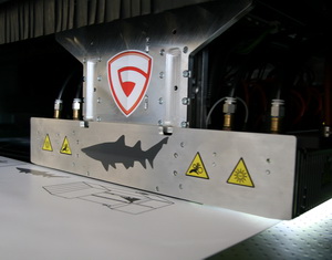 4-красочный принтер Shark — многофункциональная система для высококачественной печати рекламной продукции. Подготовленная к демонстрации на выставке опция порезки служит для разрезания материалов толщиной до 1 мм в продольном или поперечном направлениях. Самонаклад работает с листами картона и других жёстких материалов толщиной до 10 мм с макс. форматом 2000 х 2000 мм (в зависимости от плотности). Благодаря новой системе направляющих принтер развивает скорость от 40 до 120 м2/ч. Разрешение — до 960 dpi, ширина печати — до 2010 мм, длина не ограничена.