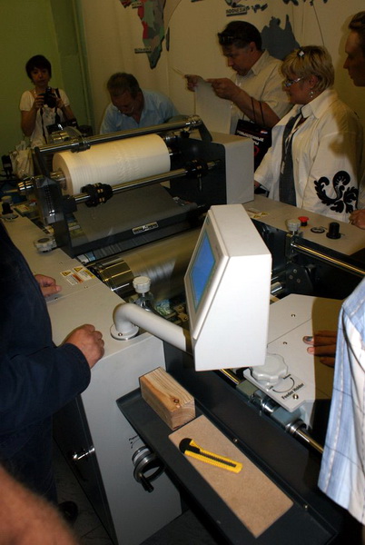 | Собравшиеся наблюдали запуск и настройку ламинатора, обступив машину плотным кольцом |