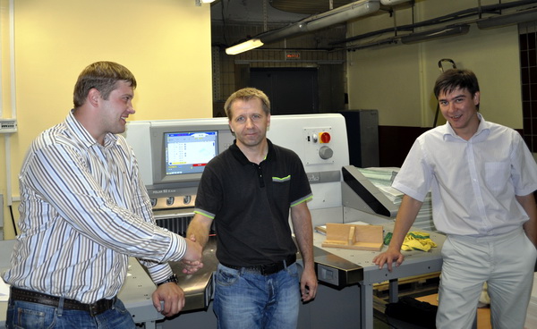 | Слева направо: торговый представитель «Гейдельберг-СНГ» в СПб Антон Закрепин, директор производства «Еврокопия-2 СПб» Дмитрий Колчин, руководитель РЦ «Гейдельберг-СНГ» в СПб Сергей Слободчиков |