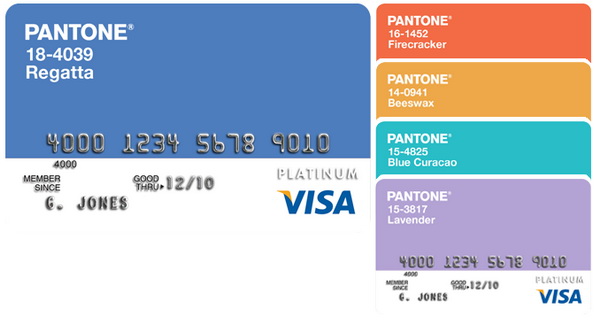 Pantone, уверенная, что стиль можно придать чему угодно, представила коллекцию кредитных карт Visa Platinum Rewards в пяти оттенках палитры Pantone — пчелиный воск, фейерверк, лаванда, регата, Блу Курасао. Как сообщает компания, карты PANTONE Visa помимо различных преимуществ позволяют зарабатывать бонусы, которые потом можно использовать для бесплатных поездок, покупок в ведущих брендовых магазинах, посещения популярных спортивных мероприятий и театральных постановок.