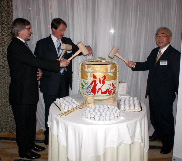 По традиционному японскому обычаю, начиная большое дело, разбивают крышку у бочки с сакэ и угощают им гостей. Слева направо: Т. Лейдлоу, Н. Пахомов, Х. Сугимото. Помимо этого ритуала состоялся и второй: рисование второго глаза куклы Дарума, что должно помочь в исполнении загаданного желания. Если оно сбывается, рисуют второй глаз, если нет – куклу сжигают и ждут в подарок следующую