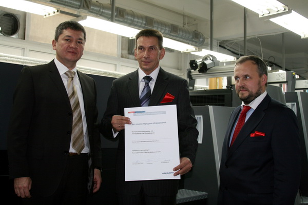 | Слева направо: генеральный директор «Гейдельберг-СНГ» Бахтиер Джанзаков, генеральный директор «Тверской фабрики печати» Евгений Жуков, зам. генерального директора «ИКБ лизинг» Андрей Голицын |