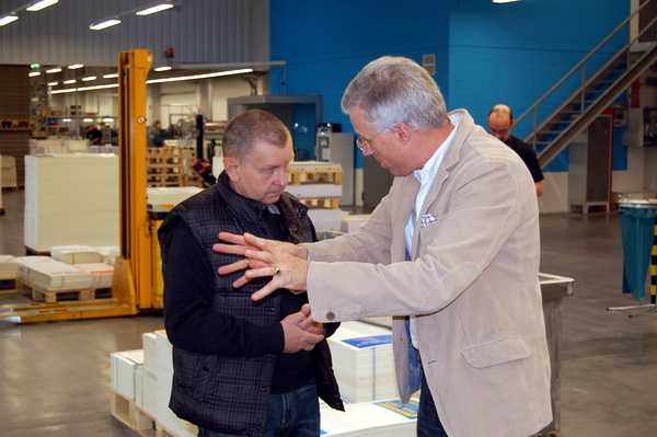 | Вольфганг Ролла дю Роси, руководитель типографии terminic из Бремена, рассказывает генеральному директору «Август Борг» Андрею Зарецкому о производственных процессах при выпуске настенных календарей |