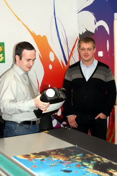 | Директор по развитию продаж цифровых решений «АТ ДЕСАЙН» Михаил Шпилькин (слева) заявил: «Как поставщик, мы заинтересованы в первую очередь в долговременных отношениях, предлагая не только оборудование, но и расходные материалы. Например – УФ-чернила Fujiflim, поставляемые прямо от производителя». Справа – Д. Шалаев |