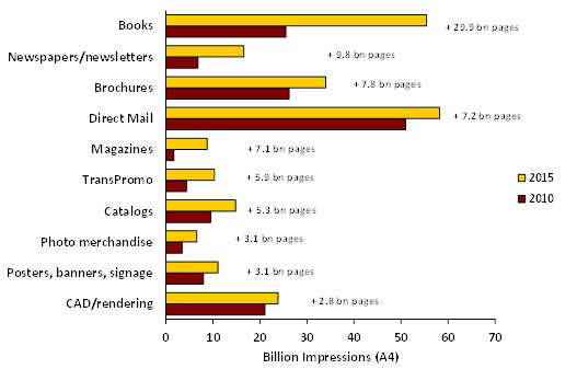 «В целом, объёмы печати в период до 2015 г. увеличатся на 2,8%, однако в некоторых сегментах скорость роста будет куда значительнее, — прокомментировал один из директоров InfoTrends Ральф Шлоцер. — Наибольший прирост по количеству страниц покажет книжный сегмент. Очень высокие темпы ожидаются для газет, букетов, прямых почтовых рассылок и журналов».