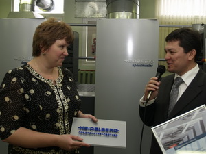 Генеральный директор «Гейдельберг-СНГ» Бахтиер Джанзаков вручил директору типографии Валентине Михнюк сертификат о присвоении звания «Предприятие-партнёр»