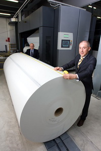 | Пьерлуиджи Гуерини, директор Mazzucchelli (справа) и рулон шириной 2860 мм для Goss Sunday 5000 с Франческо Раписарди из представляющей Goss в Италии Macchingraf |